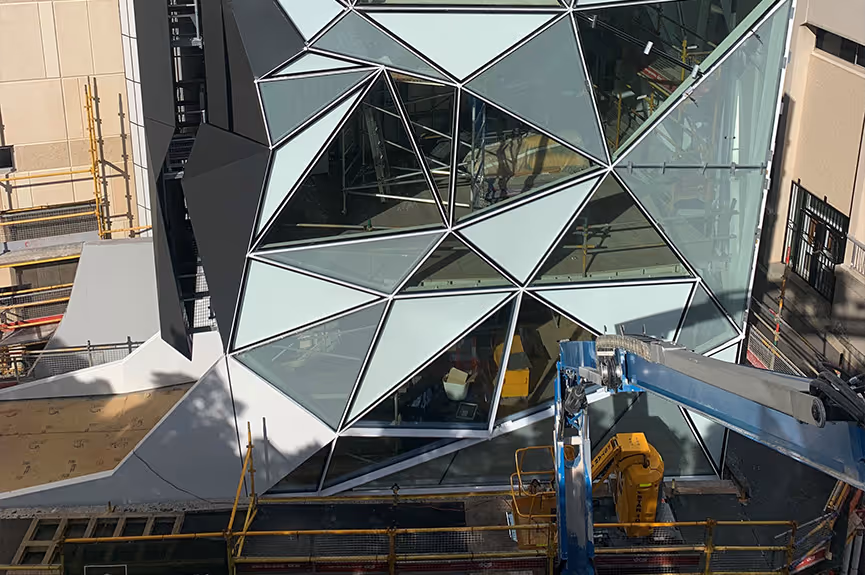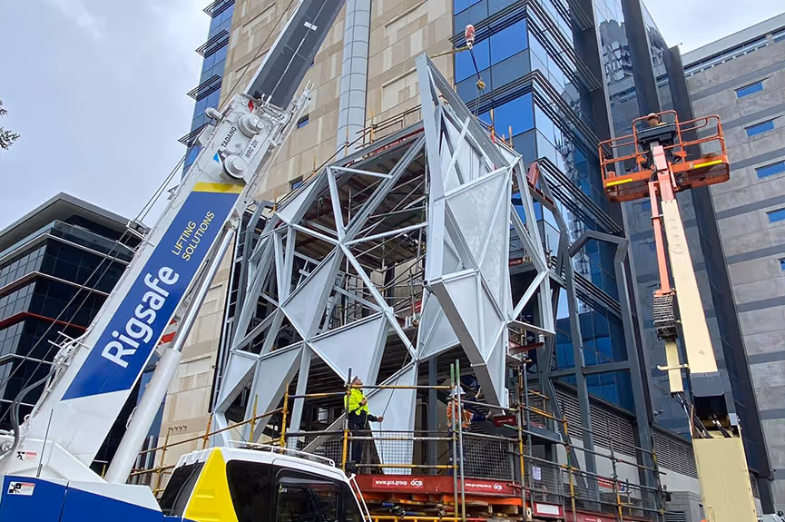 The façade installation featured 25 tons of laser-cut steel and 115 irregularly shaped glass pieces crafted into 27 oversized cranked façade elements. Rigsafe played a pivotal role, providing essential services such as transport, crainage, and rigging, ensuring the seamless installation of this project.